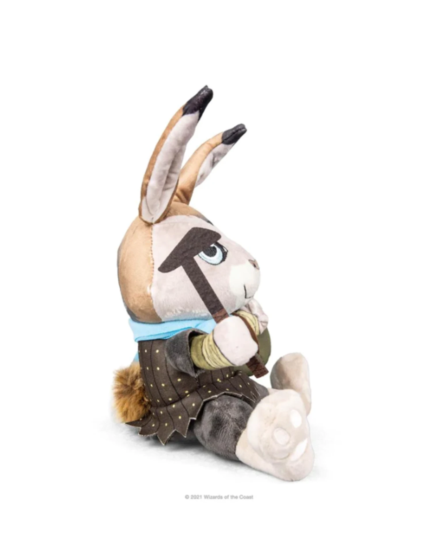 From the expanding lore of Dungeons & Dragons® as seen in the The Wild Beyond the Witchlight adventure! This harengon thief is the leader of a band of brigands but will gladly take a break to rob—er, that is, REST ON—your shelf. Agdon measures over 7 inches in the seated position and is made of the softest premium plush materials