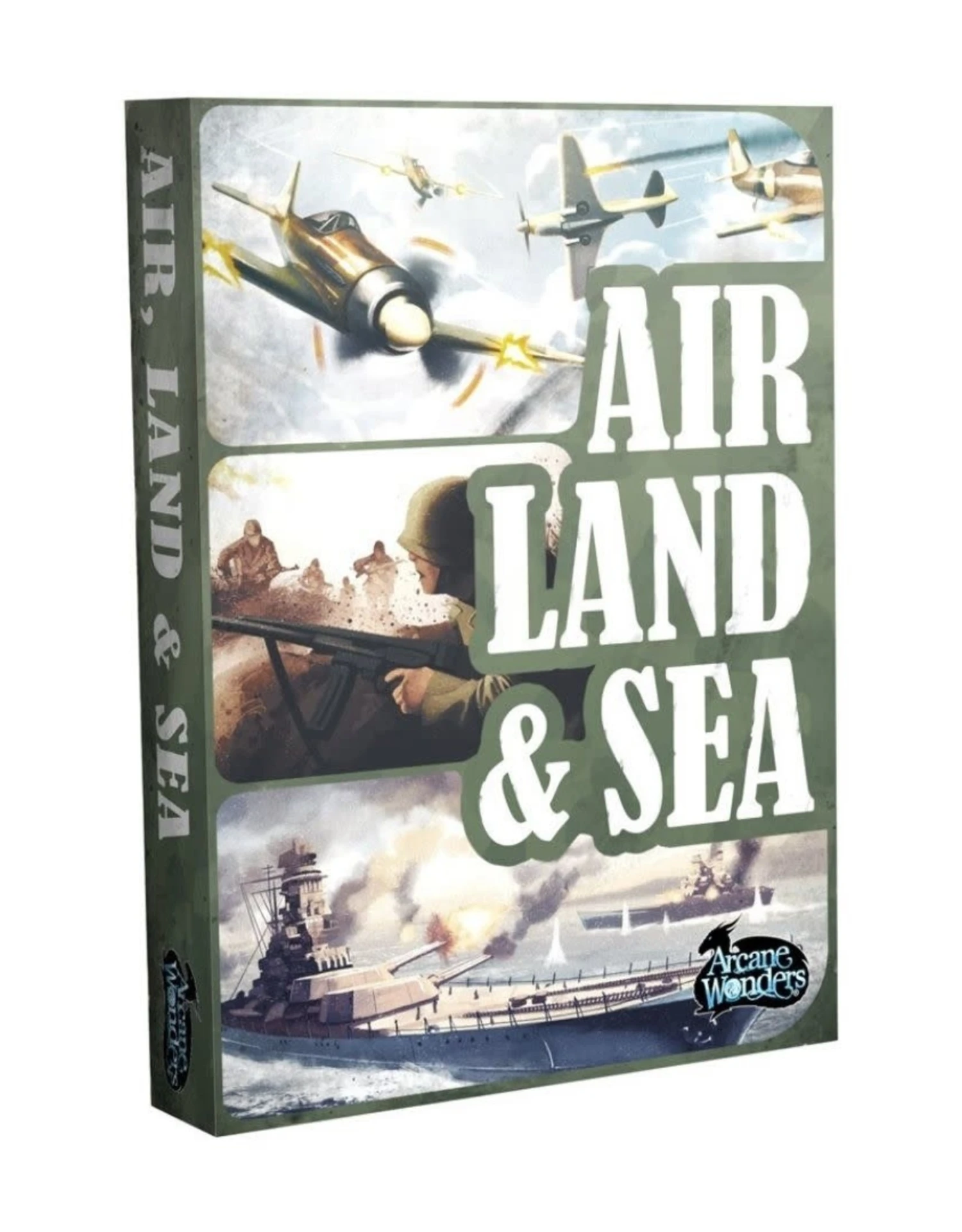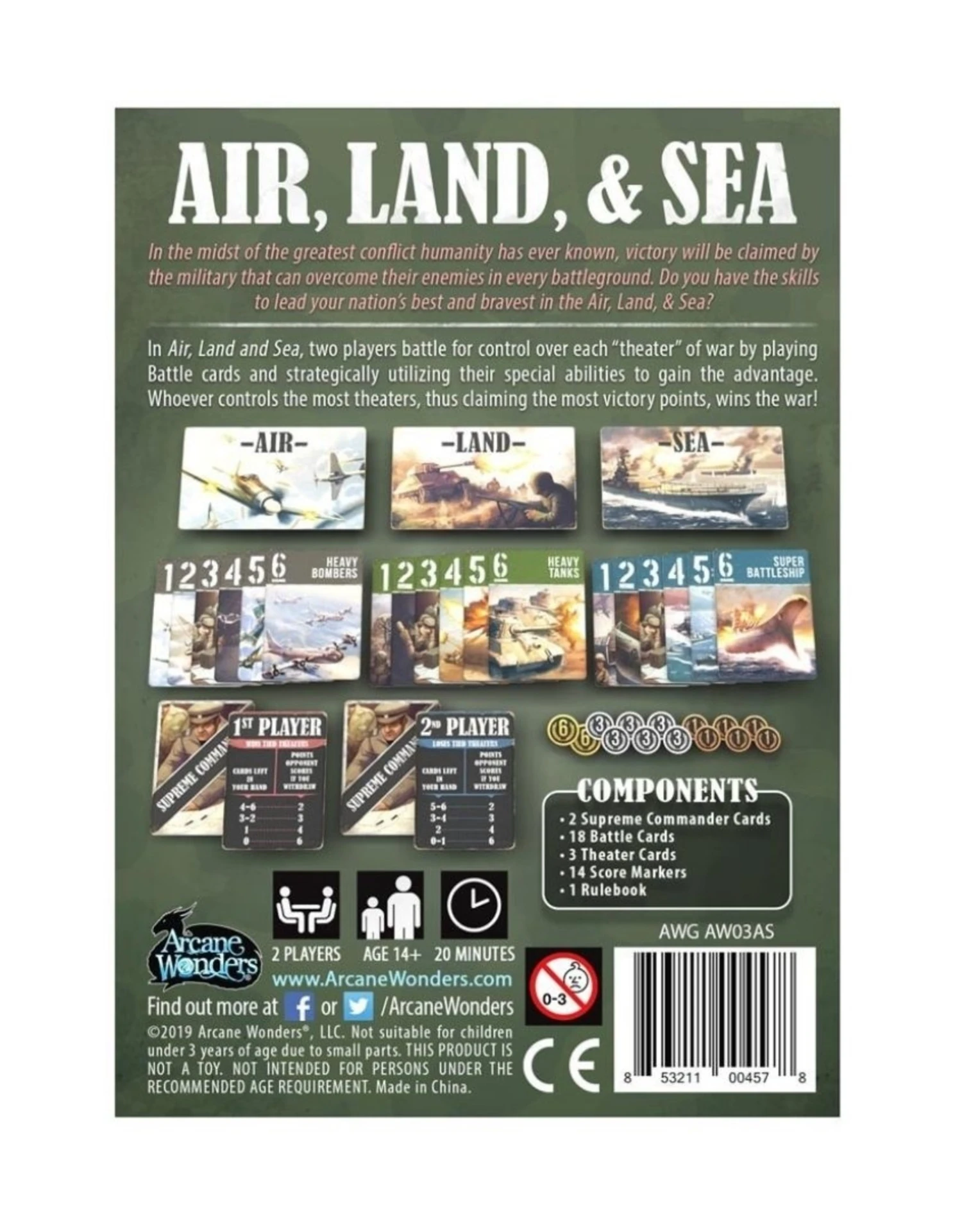 In Air, Land, & Sea, two players participate in a series of Battles, with the objective to control two of the three Theaters of war after both players have played all of their Battle cards, or convince your opponent to withdraw!