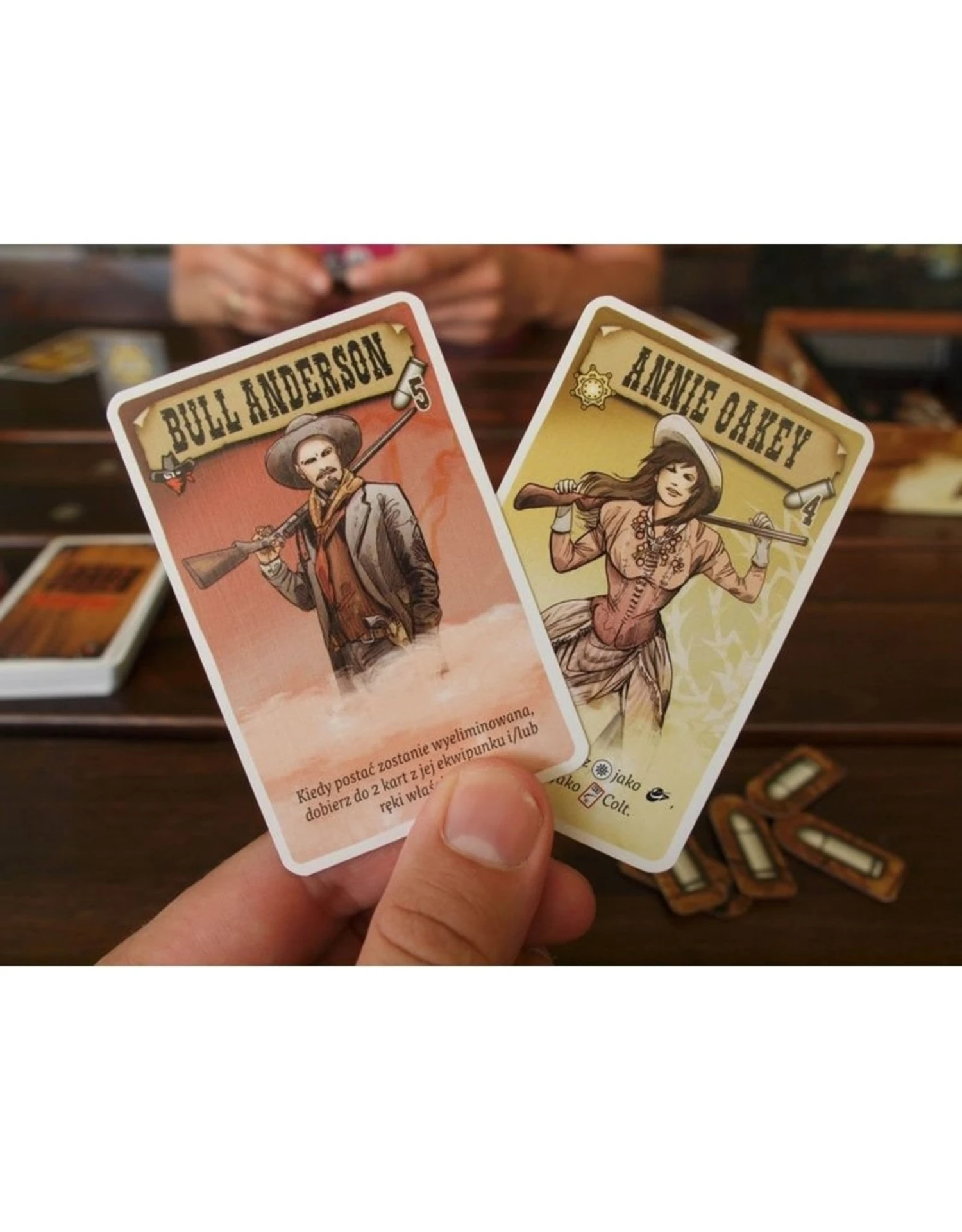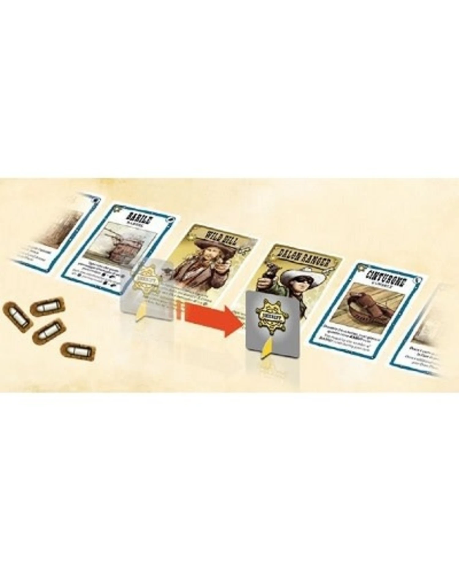 Each player also has an individual deck of action cards, with the lawful player specializing in drawing cards and the outlaw player specializing in tricks. Players take turns playing cards, trying to take out the opponent’s characters. As you do, new characters come into play, and whoever eliminates all of their opponent’s characters first wins.