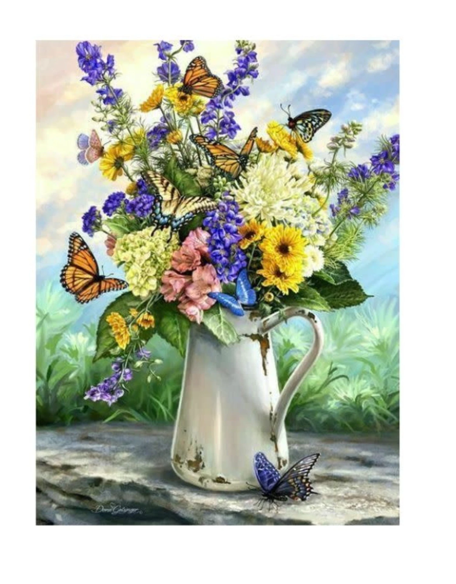 Painter Dona Gelsinger depicts a summer bouquet flourishing with lilies, chrysanthemums, zinnias, hydrangeas, and more to the delight of vibrant butterflies.