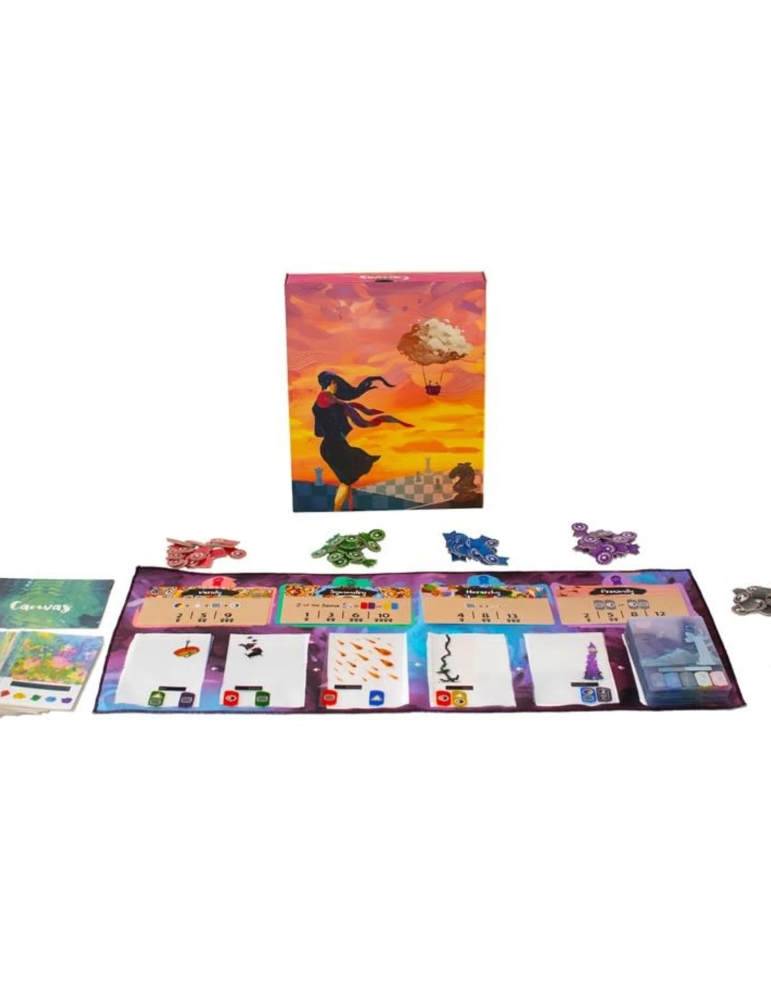 In Canvas, you play as a painter competing in an art competition. Players will collect transparent Art Cards, layering 3 of them together to create their own unique Painting. Each card contains a piece of artwork as well as a set of icons used for scoring. Icons will be revealed or hidden based on the way players choose to layer the cards making for an exciting puzzle.
