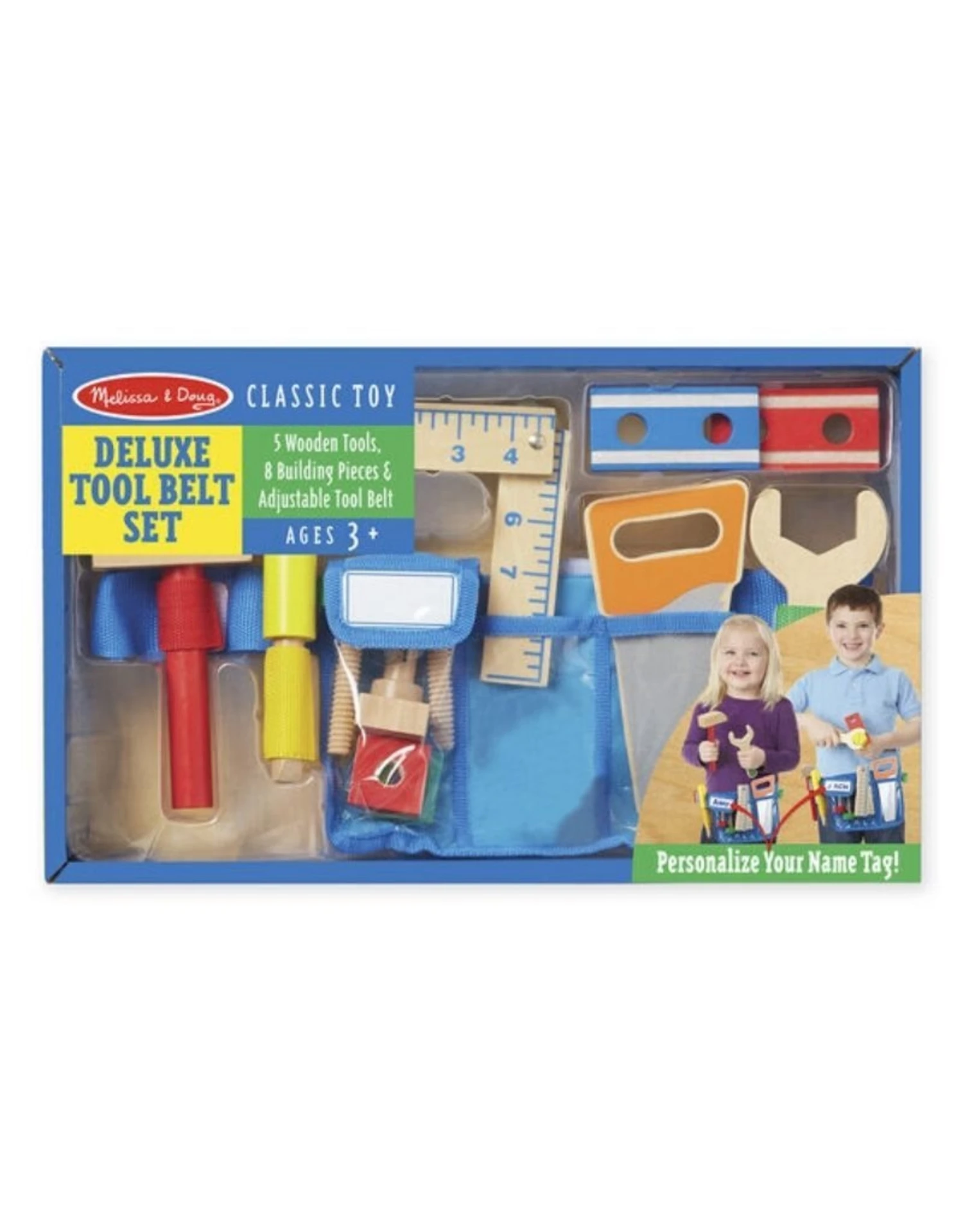 Give little builders all the tools they need to for truly constructive play! Five child-safe wooden tools–hammer, screwdriver, wrench, ruler, and painted saw–fit snuggly in the adjustable tool belt and a child’s hand. Saw apart the self-sticking blocks and use the nuts and bolts or safety nail (no sharp points) to connect them again! A name tag on the sturdy tool belt can be personalized with a pencil or washable marker. This set helps teach sorting, problem solving, and counting skills, and encourages fine motor skills, hand-eye coordination, and imaginative play.