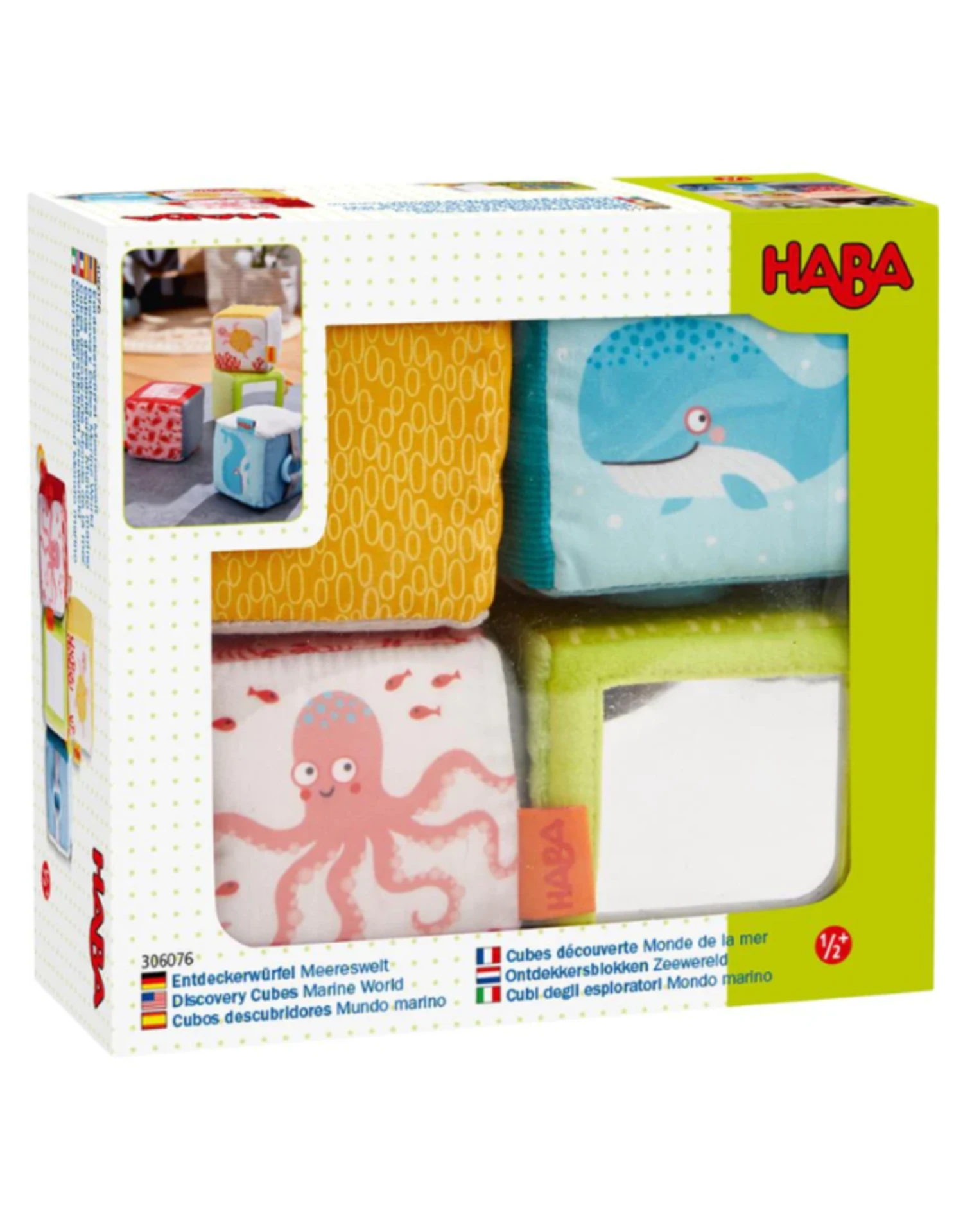 The fantastic, machine washable marine world soft discovery blocks offer much more than just stacking. A rattle, mirror foil, clattering sound effects and crackling foil stimulate baby’s senses and are an inspiration to play and explore. The bright colors and different materials and textures also open little ones to tactile and visual discovery. Each cube measures 3″ x 3″.
