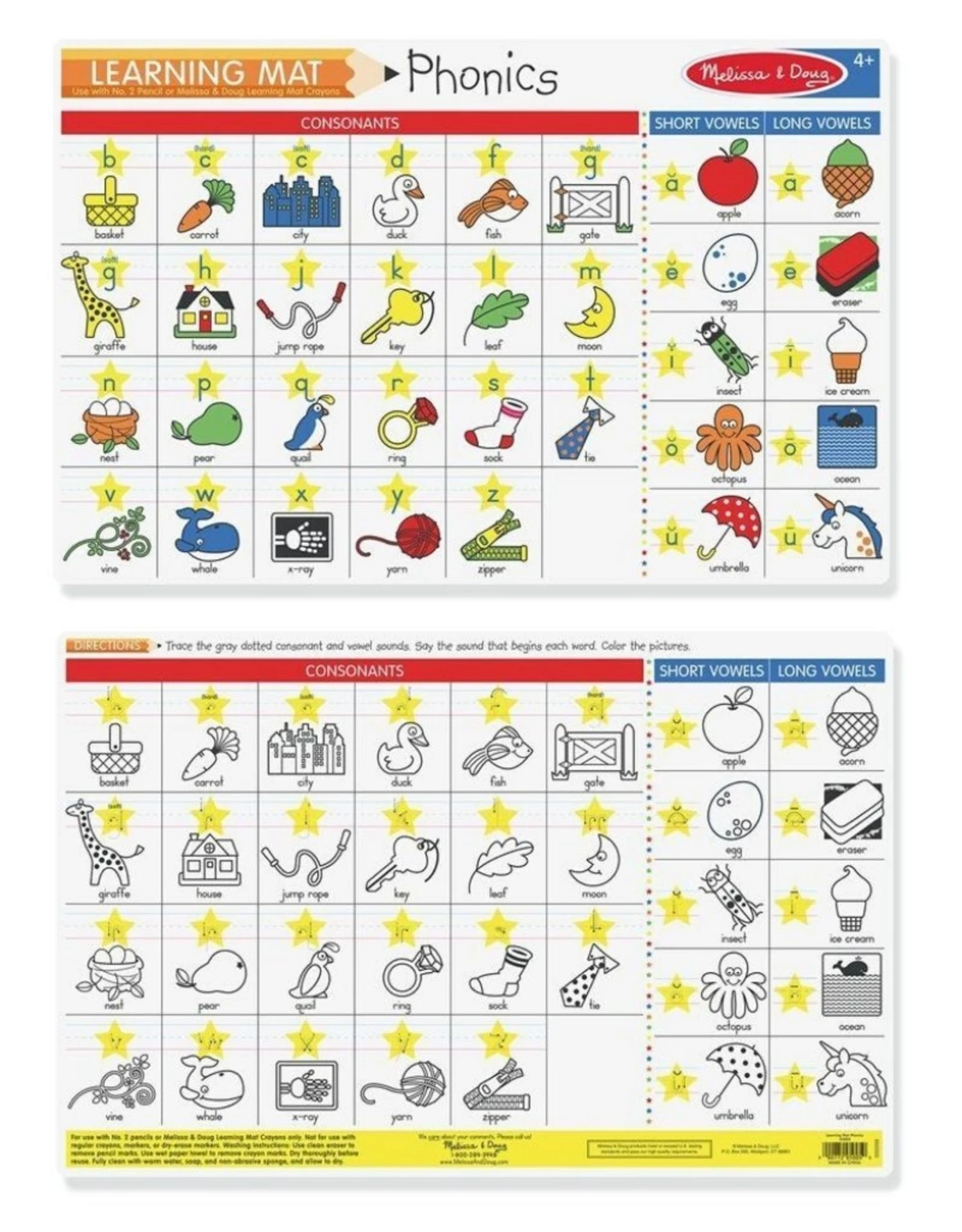 A table mat for kids to learn to learn their phonics. Introduce phonics and vowels in a fun and engaging way. This is a double-sided mat, one side with pictures and numbers, the other side for kids to draw on. Use only No.2 pencils (not included) or Melissa & Doug Learning Mat Crayons. Play becomes active learning–and mastering these important academic skills becomes as easy as A, B, C and 1, 2, 3!