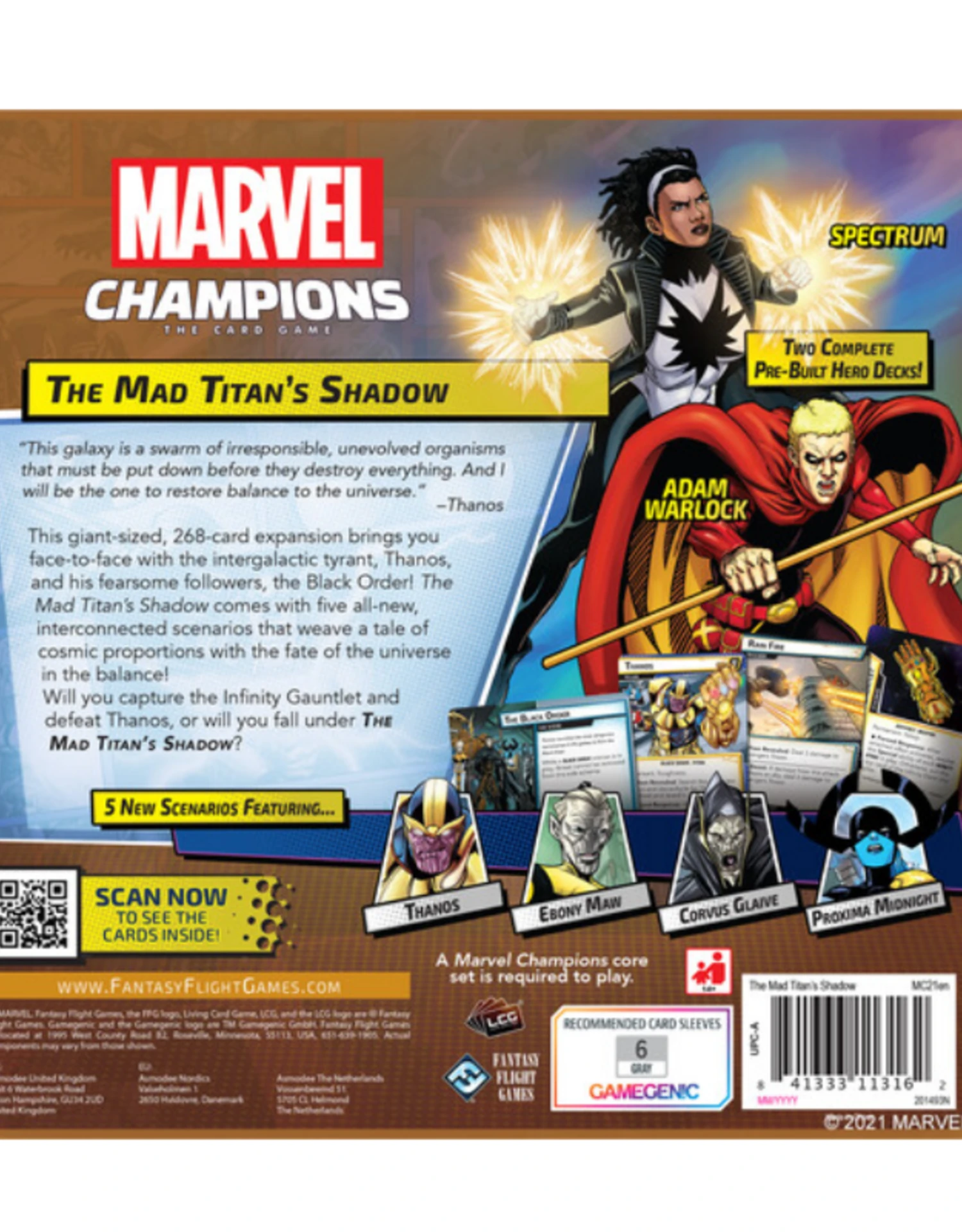 In this third campaign expansion for Marvel Champions: The Card Game, you and your fellow heroes must challenge the forces of Thanos. This massive expansion contains a brand-new campaign featuring five thrilling scenarios pitting you against members of the zealous Black Order, including Ebony Maw, Proxima Midnight, Corvus Glaive, and, of course, the Mad Titan himself. As with previous expansions, you can play each of these scenarios individually or as part of a larger campaign, and with a slew of new modular encounter sets, there will be ample opportunity to mix things up for all of your Marvel Champions content. Of course, a new wave of expansions means more heroes as well, and The Mad Titanโs Shadow starts it off with the mighty champions Adam Warlock and Spectrum, both of whom come with fully pre-built and ready-to-play decks right out of the box.