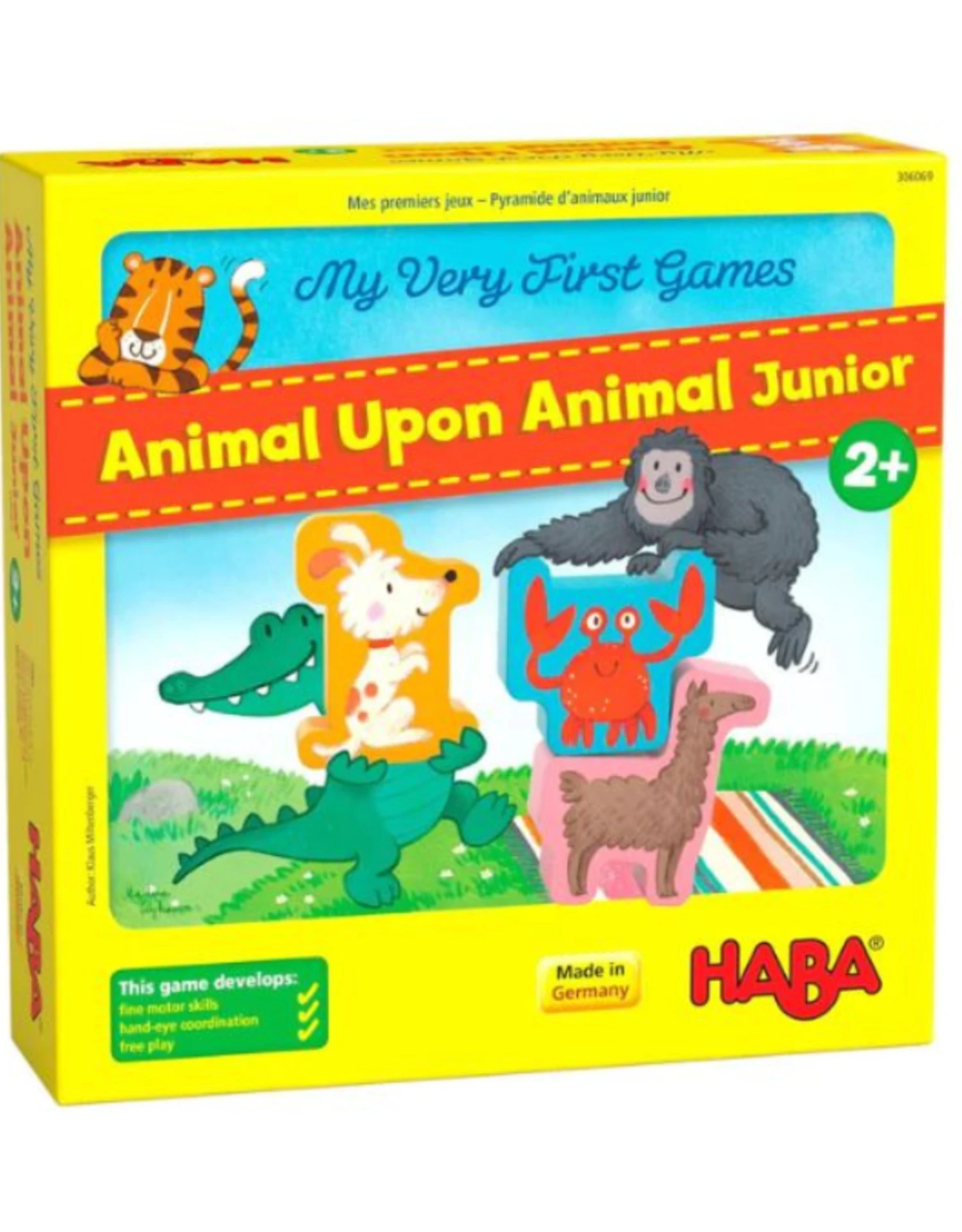 Things are getting wildly wobbly as the animals create a big stacking tower. Who will climb on whom? The die decides. But whether the animal stack stays standing or not is up to the players. They stack Animal upon Animal in three new games for young stackers. In the third game, they work cooperatively to race against the crab, training their dexterity skills with play. May the best stacker win!
