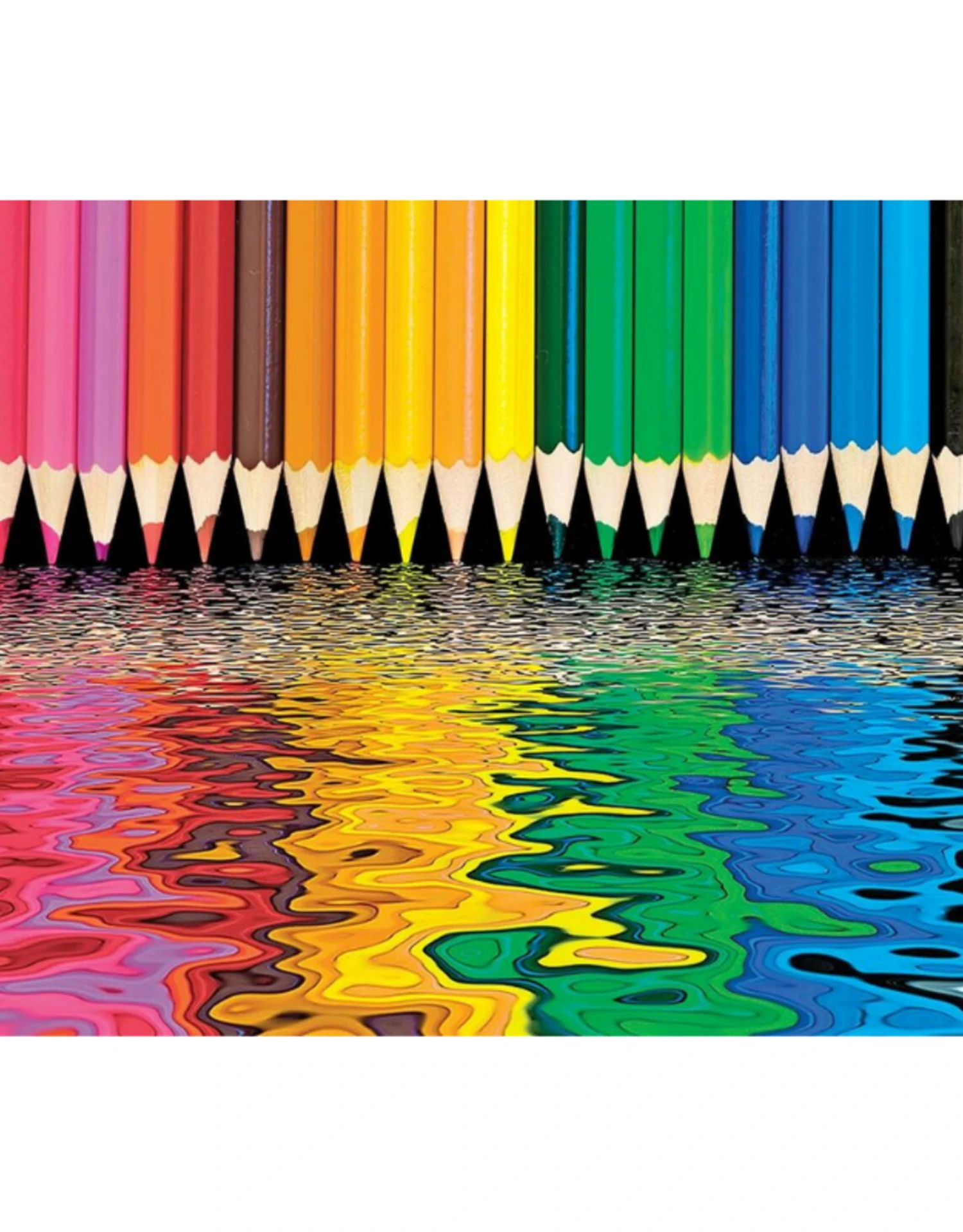 A row of colored pencils, in stark lines of vivid colors, contrasts against the swirling, liquid-like reflections of the bright hues.