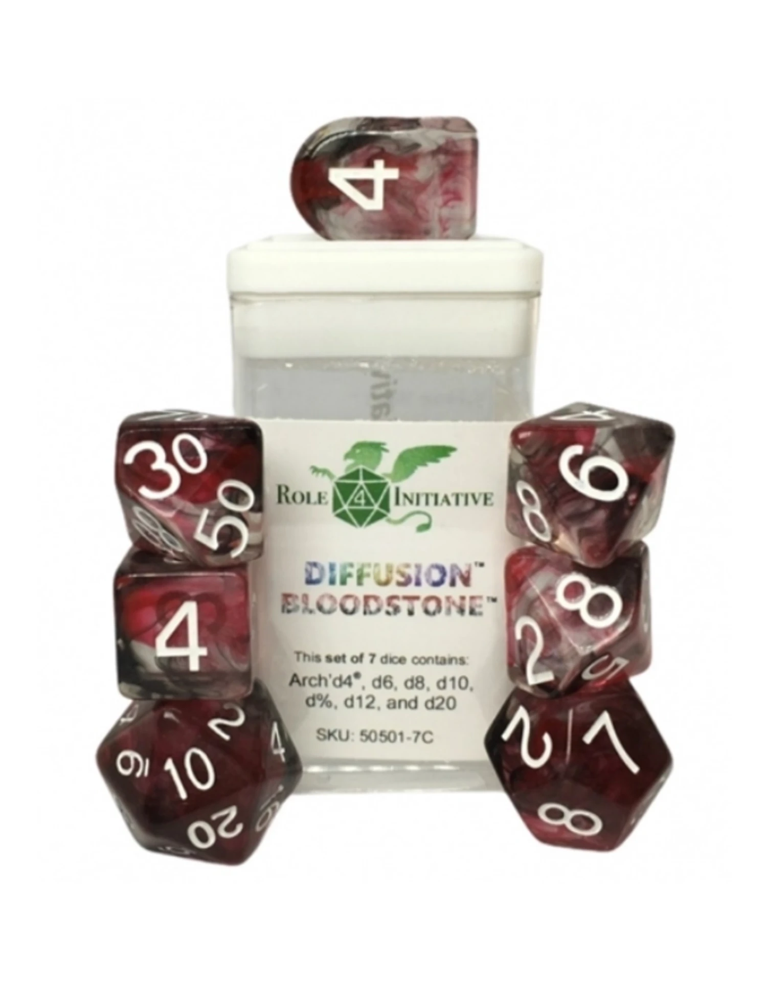 This set of 7 polyhedral dice is designed in R4I’s beautiful two-color wispy Diffusion Bloodstone style. It includes our unique Arch’d4 and Balance’d20.