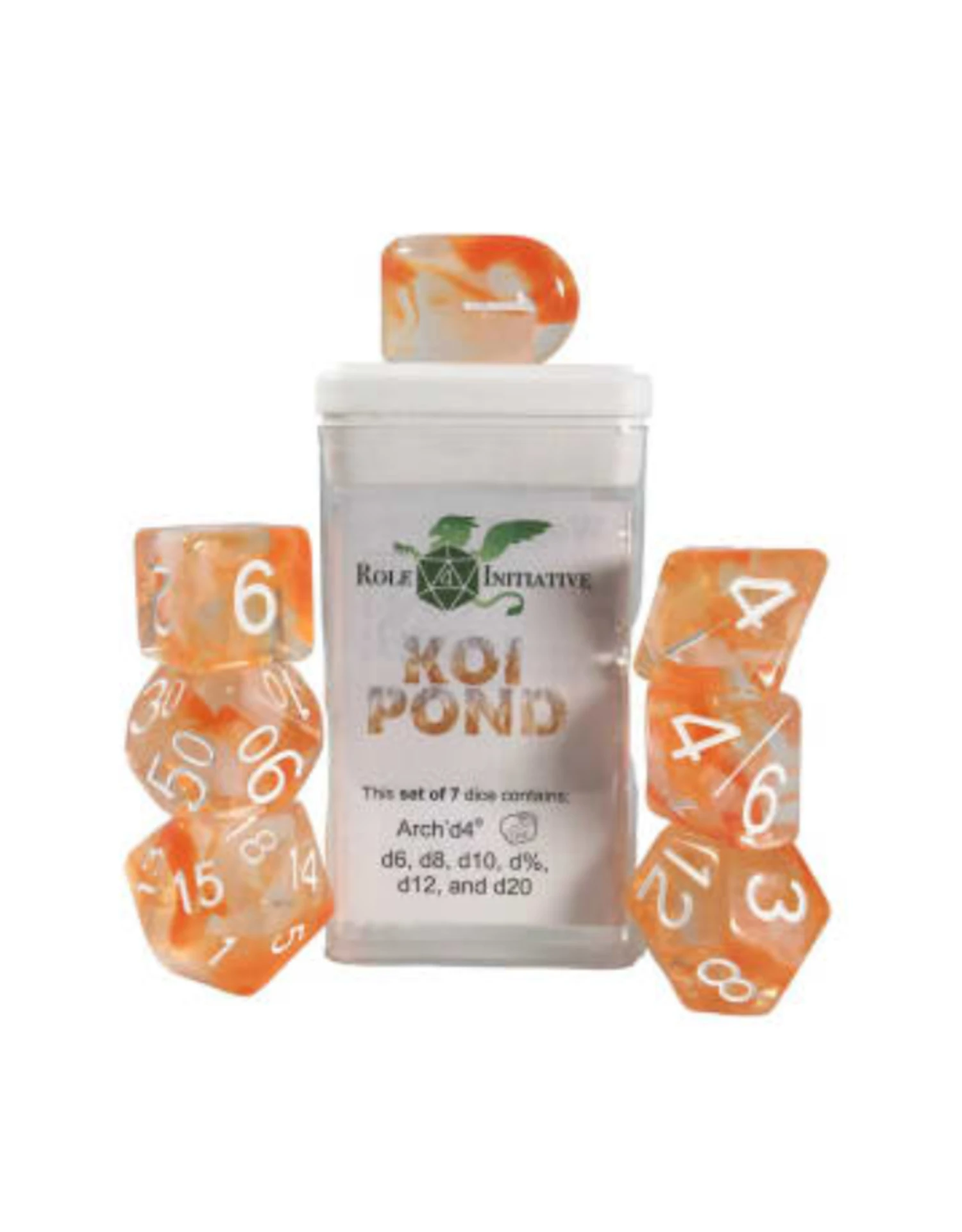 Set of 7 dice contains Arch’d4, d6, d8, d10, d5, d12, and d20.