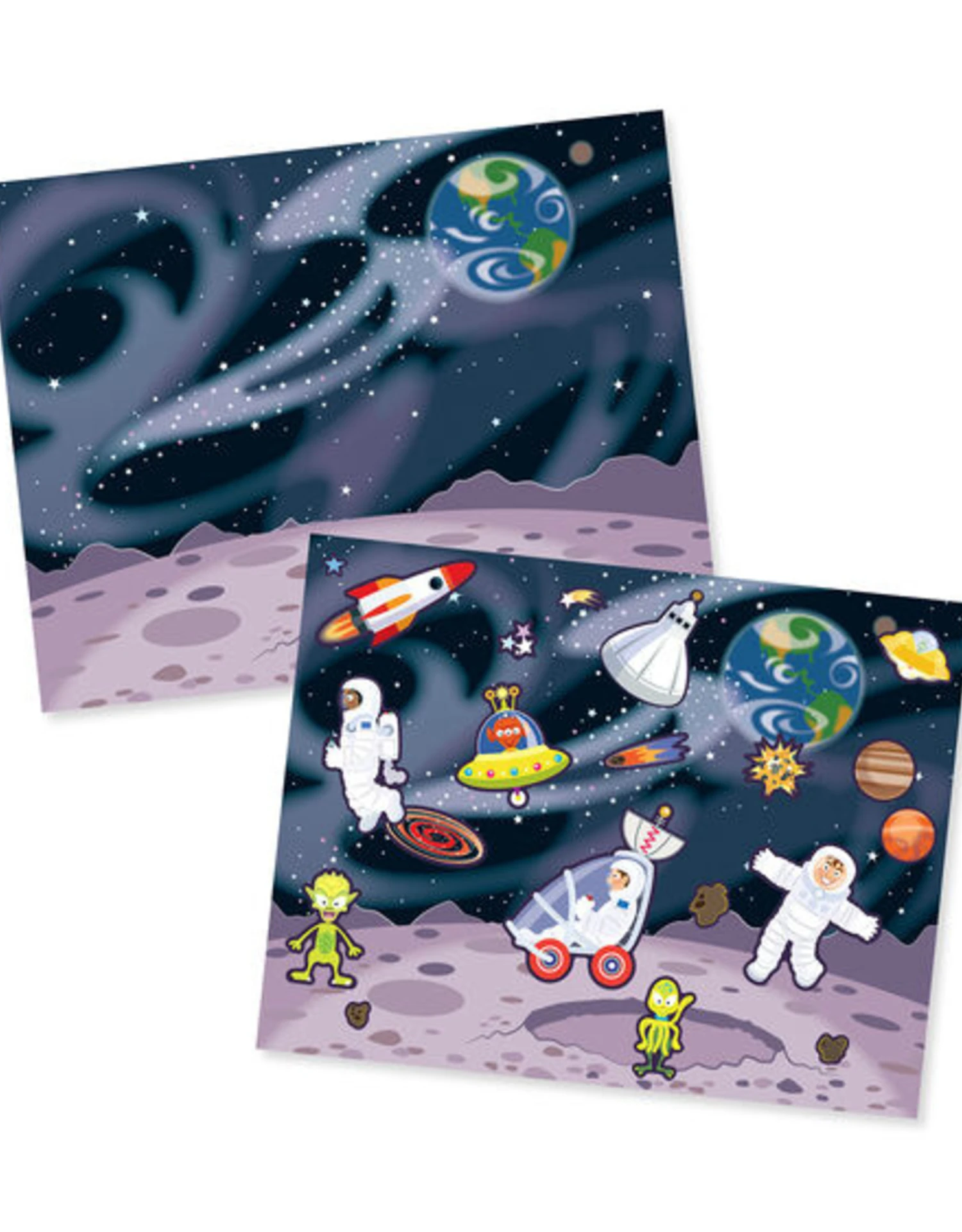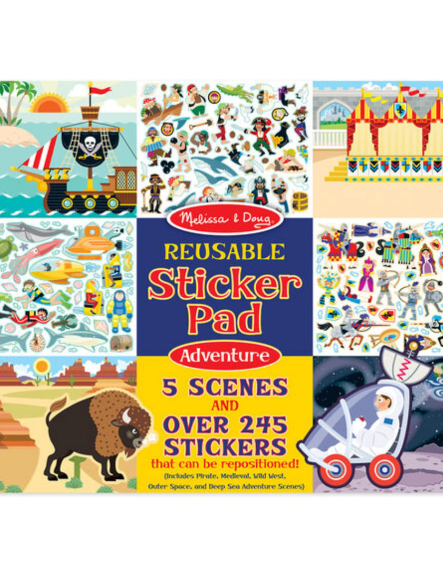 Fill the reusable scenes with more than 245 cling-style stickers, and create your own pirate, medieval, space, deep sea, and wild west adventures! To set the scene and spur the imagination, five glossy, full-color backgrounds feature lots of space to play creatively. They pull out cleanly too–so this cool set is easy to share. The colorful, kid-friendly stickers, which are organized by theme, stick easily, pull up cleanly, and can be used again and again to keep the action and adventure coming.