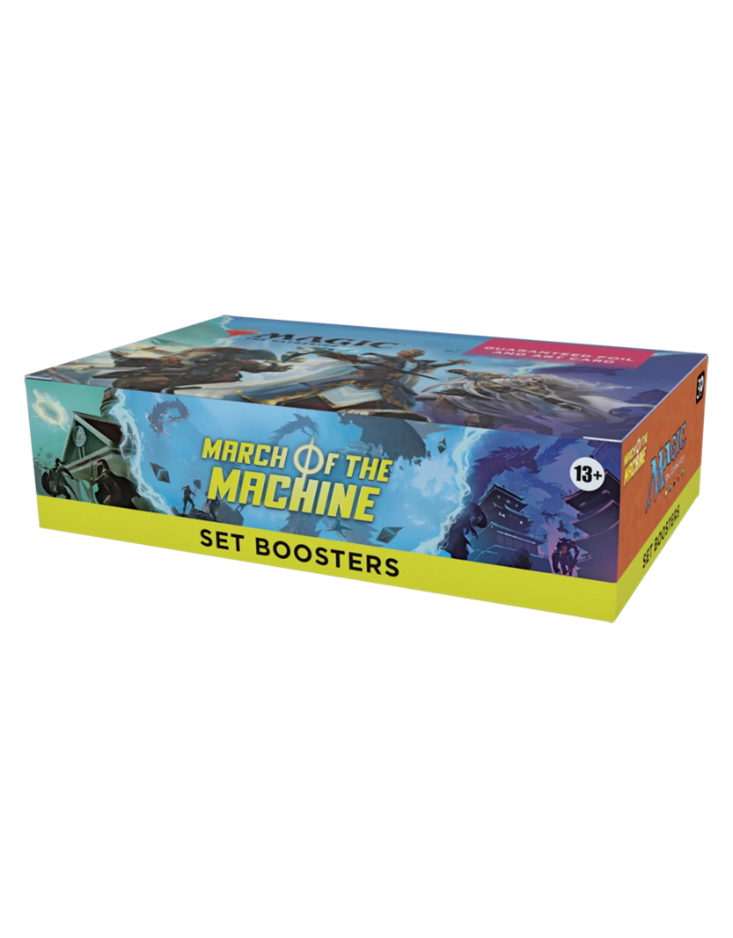 The March of the Machine Set Booster Box contains 30 March of the Machine Set Boosters. Each Set Booster contains 12 Magic cards, 1 Art Card, and 1 token/ad card, Helper card, or card from “The List” (a special card from Magic’s history—found in 25% of packs).
