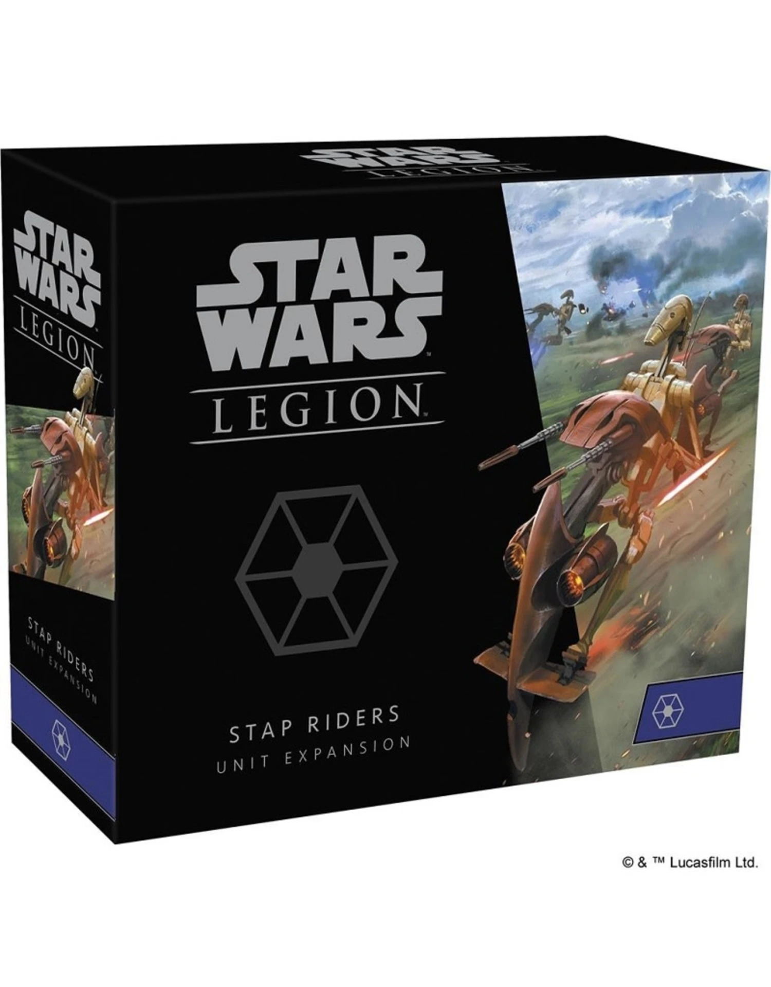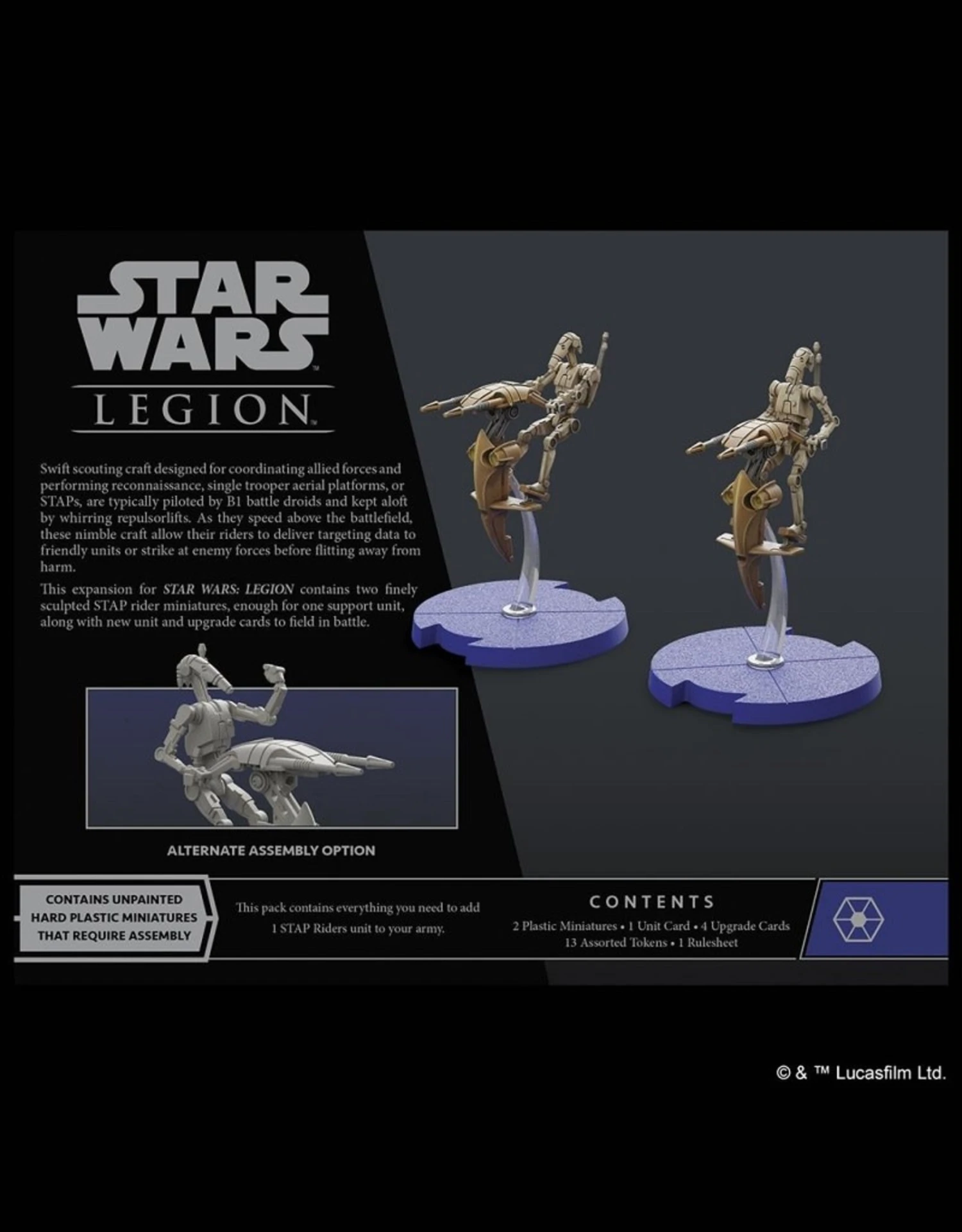 Swift scouting craft designed for coordinating allied forces and performing reconnaissance, single trooper aerial platforms, or STAPs, are typically piloted by B1 battle droids and kept aloft by whirring repuslorlifts. As they speed above the battlefield, these nimble craft allow their riders to deliver targeting data to friendly units or strike at enemy forces before flitting away from harm.Within the STAP Riders Unit Expansion, you’ll find two beautifully detailed, unpainted STAP rider miniatures that featuring a number of customization options. Two different flight stands let you depict them at different heights, while the STAP pilots themselves can be assembled in a variety of poses. Finally, four upgrade cards invite you to equip them with comms systems to more fully integrate your STAP riders into your army.
