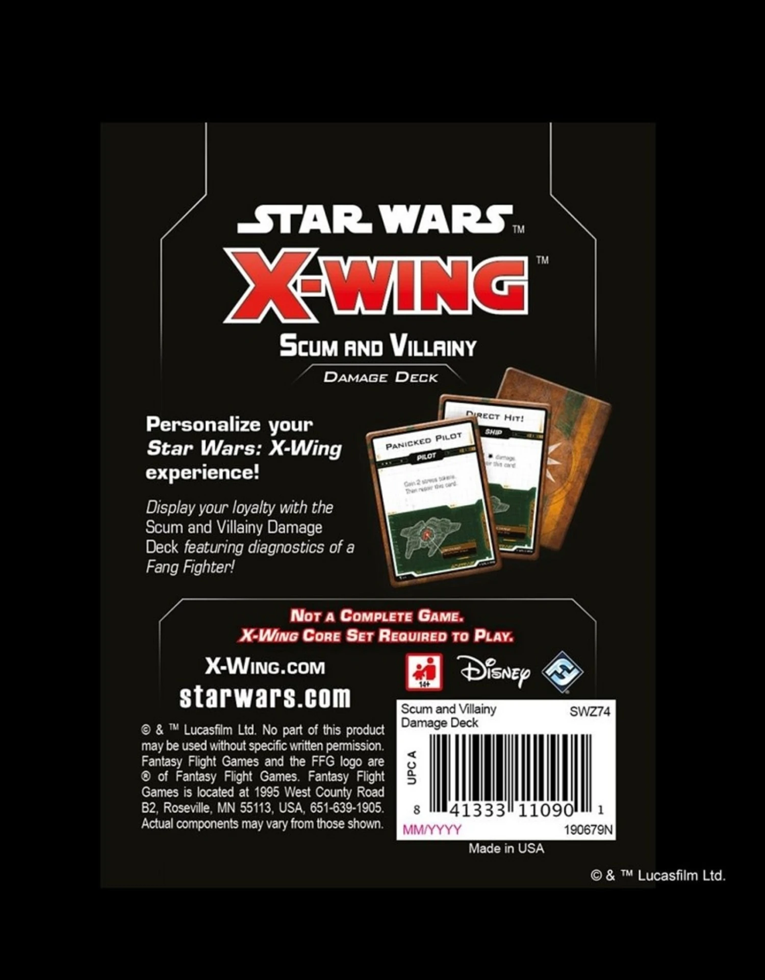 Personalize your Star Wars: X-Wing experience and display your loyalty with the Scum and Villainy Damage Deck! This deck contains a complete set of thirty-three illustrated damage cards featuring diagnostics of a Fang Fighter so you know exactly where your ship is hit.